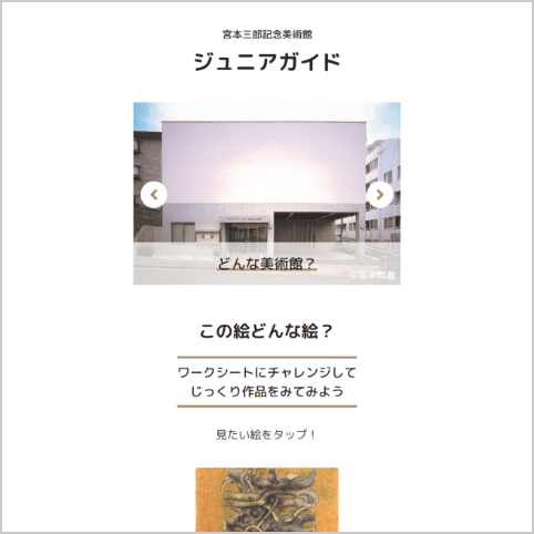 世田谷区が建築した昭和洋画壇を代表する画家、宮本三郎氏の作品を所蔵する美術館の小・中学生向けのスマホ・タブレットサイトを制作。展示室作品の紹介に加え、自宅で画像をみながらチャレンジするワークシートと、参加者の写真やコメントの公開も行うなど、ユーザー体験にも拘った情報ガイドに致しました。