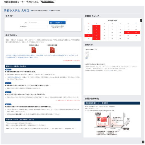 三軒茶屋キャロットタワー内にある市民活動支援コーナーの会議室、又は機器等の予約をオンライン上で行えるシステムを新規開発、導入。人的対応だった予約受付業務を自動化することでフロント対応を簡便にし、顧客管理やスケジュール設定など管理機能を充実させることで顧客フォロー向上にも取り組みました。